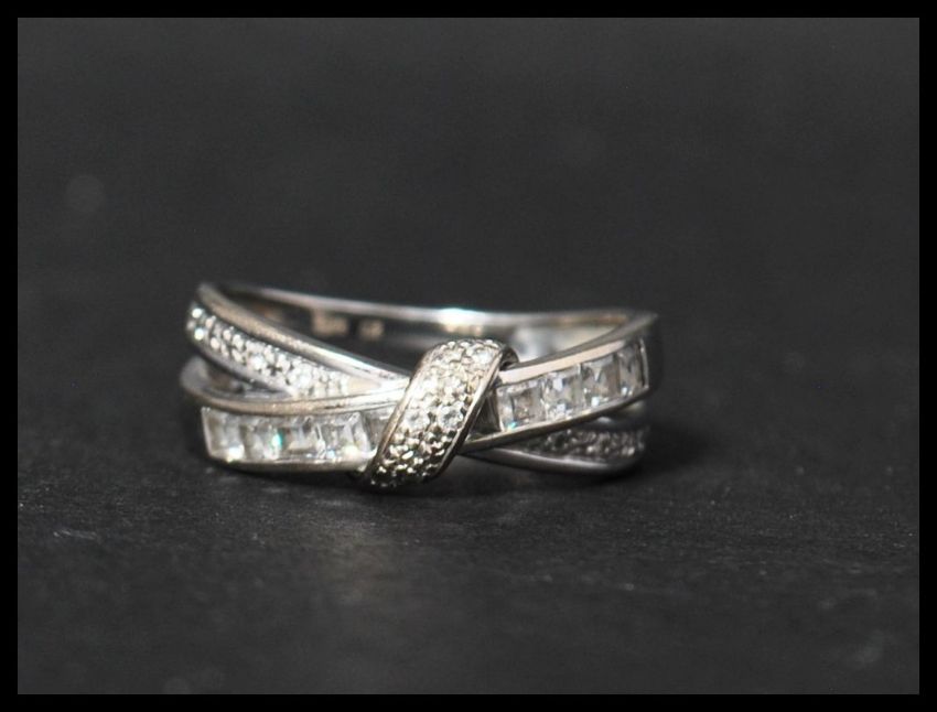 A hallmarked 9ct white gold and CZ ring having square and round cut CZ in a crossover setting. Hallmarked London. Weight 2.7g. Size M.