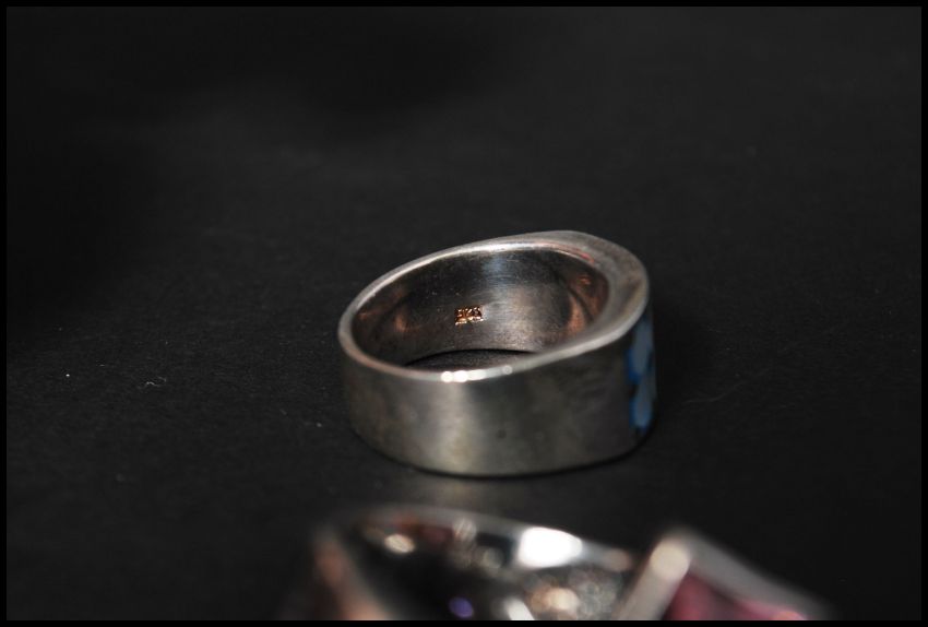 Two hallmarked 925 silver dress rings one hallmarked Sheffield the other Birmingham. Total weight 27g. Sizes Blue T, Pink Q.