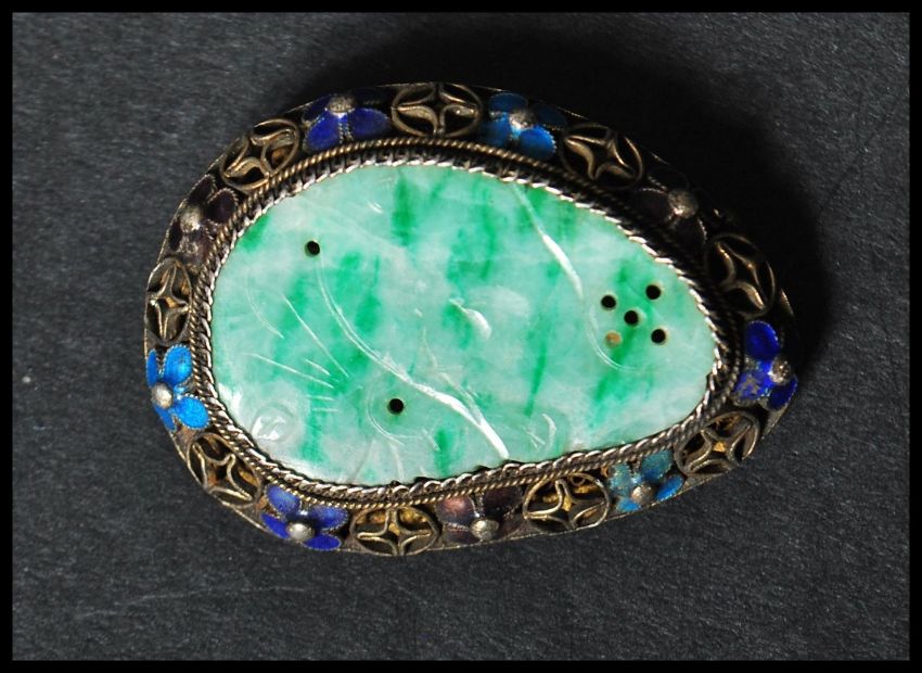 A 1920's Chinese export silver, enamel and carved jade brooch pin having a central carved jade designed with filigree and enamel decoration with C Clasp. Marked Silver. Measures 4cms