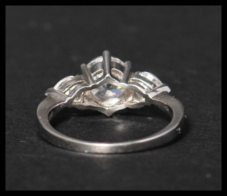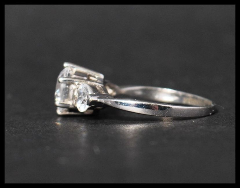 A hallmarked 9ct white gold ring set with a central round cut CZ and accent heart shaped CZ to shoulders.  Hallmarked  Sheffield.  Weight 2.7g  Size I.5.