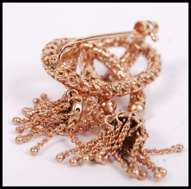 A 9ct gold ladies brooch of unusual form having cross over design with drop finials. Total weight 8.5g