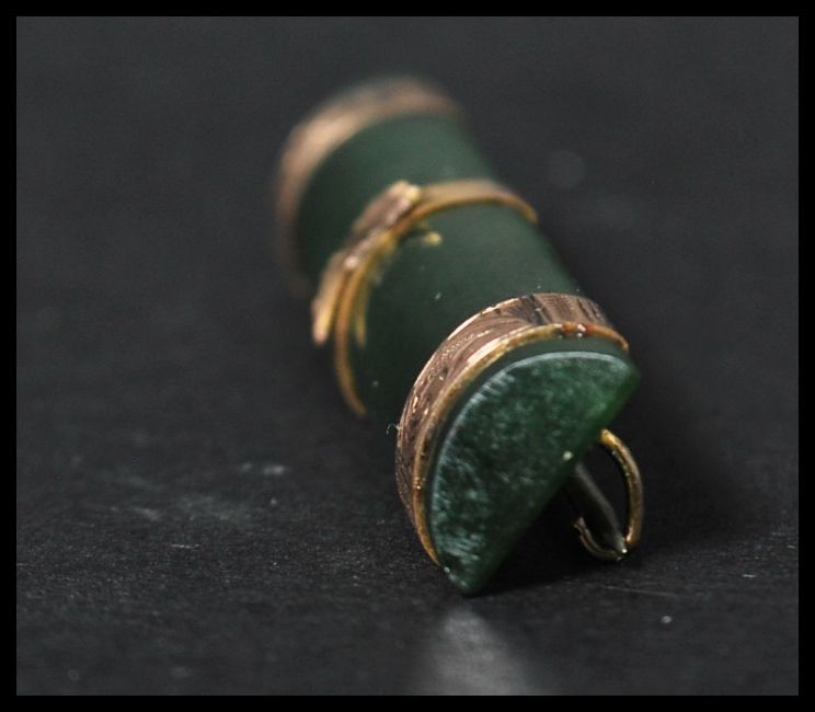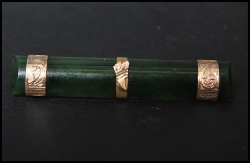 A Victorian 9ct gold and jade bar brooch, the jade being mounted with three gold bands with etched and relief decoration, having a c clasp. Marked 9c tests 9ct gold. Measures 5.5cms.