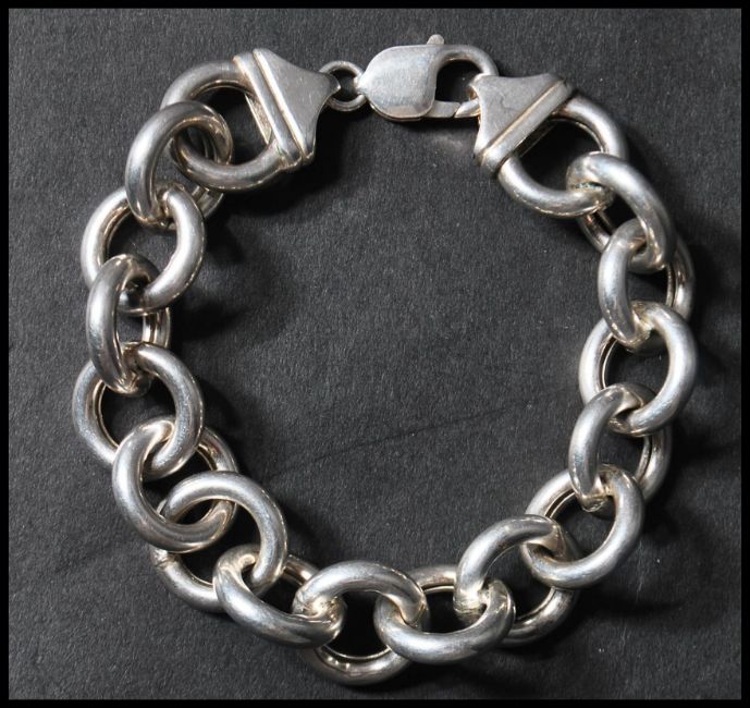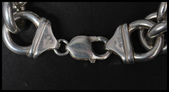 A hallmarked Italian 925 silver large polo link bracelet with lobster claw clasp. Import marks for London. Weight 34g. Measures 8.25 inches.
