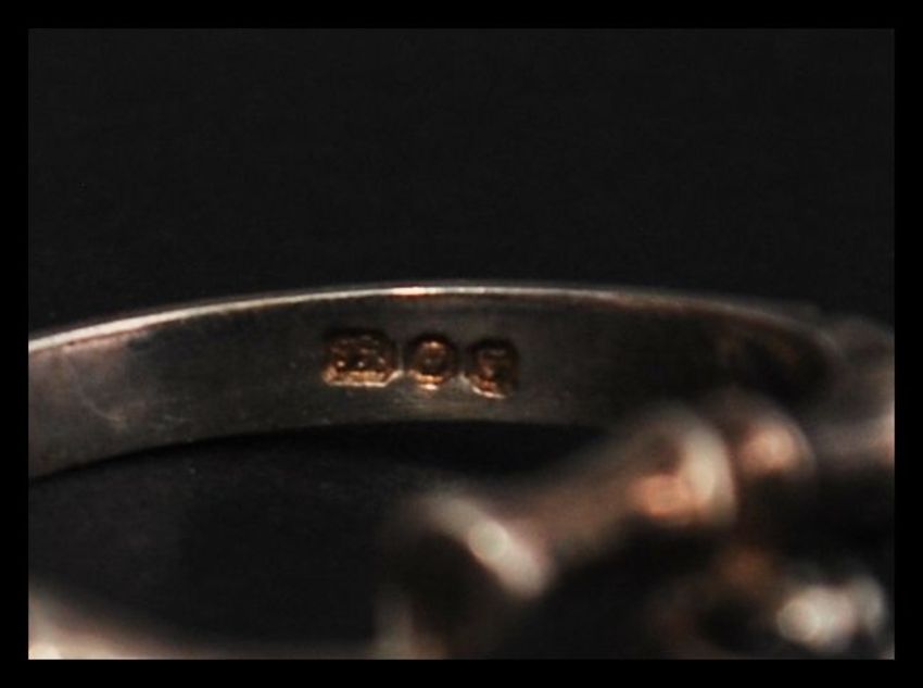 A hallmarked 925 silver and sapphire ring having a prong set sapphire in stylised bamboo crossover setting. Hallmarked London. Size L.5.