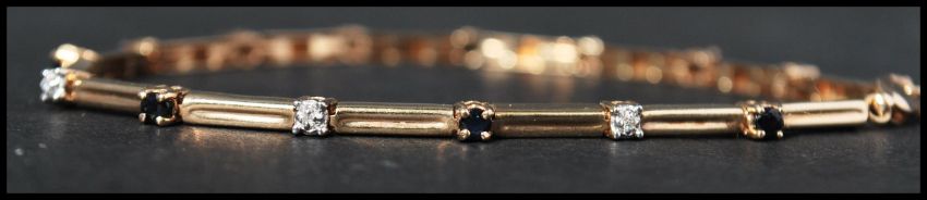 A hallmarked 9ct gold sapphire and diamond bracelet. The bracelet being set with 8 sapphires and 7 illusion set diamonds having a lobster claw clasp. Hallmarked Birmingham. Measures approx 7.5 inches. Weight 3.8g.