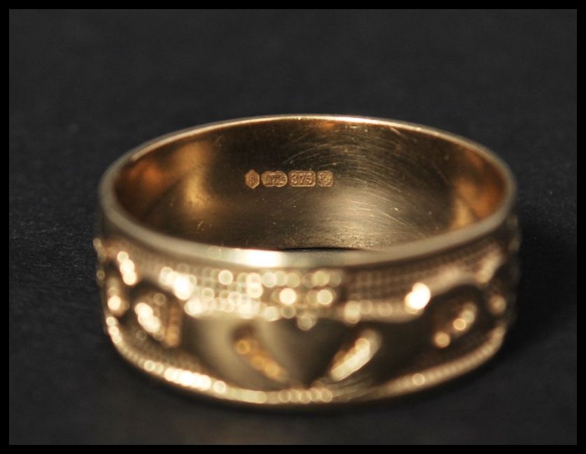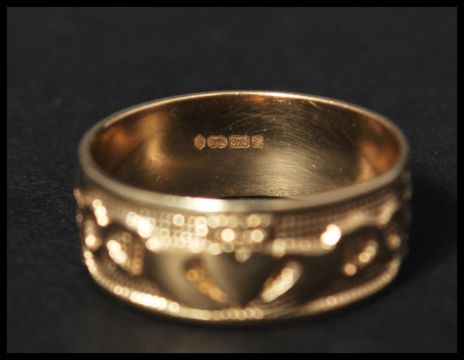 • A hallmarked 9ct Gold Claddagh band ring inscribed  "with my two hands I give you my heart and crown it with my love". Hallmarked Sheffield. Weight 5.1g. Size S.5.