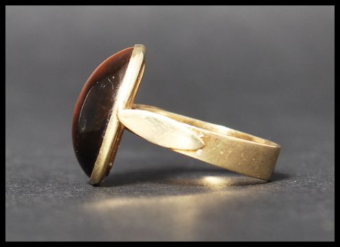 A hallmarked 14ct gold and tigers eye ring, set with a tigers eye cabochon with stylised shoulders. Hallmarked for Yugoslavia ZT 585. Total weight 3.6g. Size M.5.