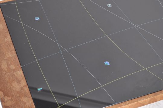 A retro 1950's Atomic / Sputnik large teak wood coffee table having astronomical inspired glass top raised on tapered supports