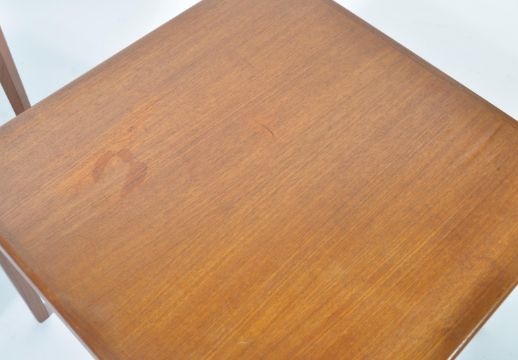 A pair of mid century Danish influence square side tables in teak wood. Each with tapering legs to the corners having a fitted frieze with squared chamfered edge table tops
