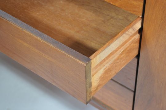 Bath Cabinet Makers - A retro 1960's teak wood sideboard having a bank of four drawers offset from centre flanked by cupboards one of which being a twin door, each having shaped handles. The sideboard having a fitted frieze to bottom raised on tapering stub legs. Matching table in lot 95.