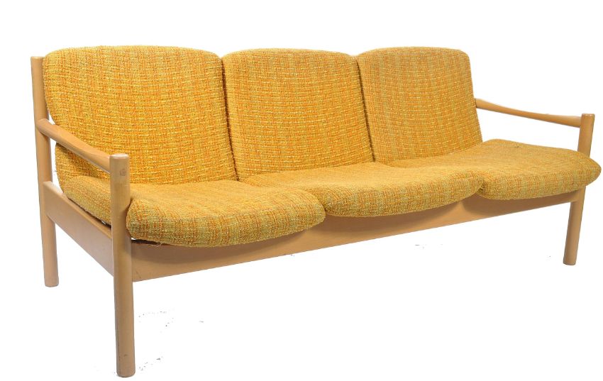 A rare pair of 20th century Ercol ' Staff ' sofa settee's. Each 3 seat sofa having turned legs with shaped elbow rests and both being complete with the original orange waffle style upholstered cushions to each. Measures 70cm high x 167cm wide x 68cm deep.
