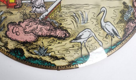 A pair of 1950's convex glass transfer printed retro wall paintings. Each with convex glass having geisha's and scenes of villages etc, the back panel interiors having skyscapes. Measures 41 cm diameter.
