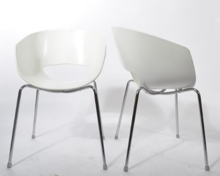 A pair of Italian designer Sintesi " Orbit " dinning chairs raised on chrome supports, stamped to base Made In Italy. Measures 80cm high x 53cm wide