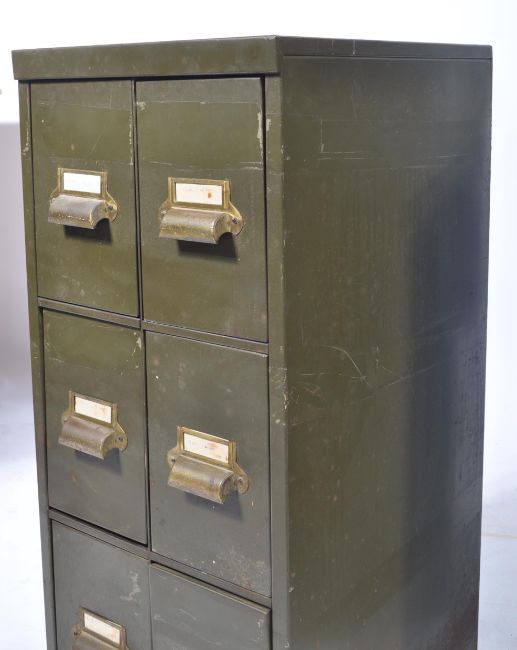 A rare pair of mid century Industrial military British green metal filing cabinets. Each of pedestal form with central run of 6 drawers to each complete with pull handles and notation slides