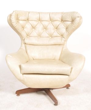 A good 1960's believed Greaves & Thomas  retro  batwing swivel armchair being raised on a teak quadruped base having cream faux leather vinyl upholstery with a stunning oversized batwing frame
