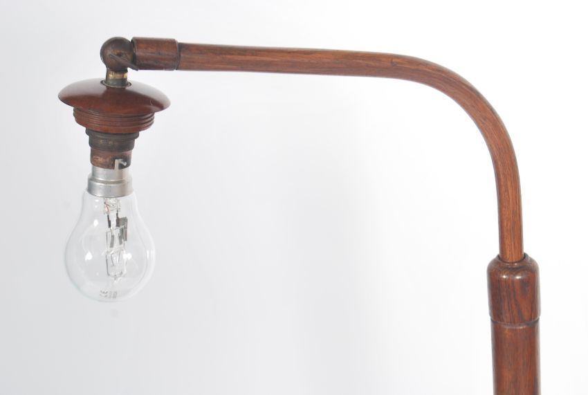 A 1960's / mid century retro teak wood standard lamp / side table combination being raised on turned angular legs having a triangular table with upright column lamp atop