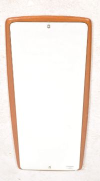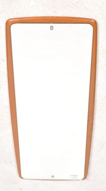 A 20th century retro, circa 1970's atomic teak wall mirror. The frameless mirror applied to a shaped teak panel. Measures 97cm high x 34cm.
