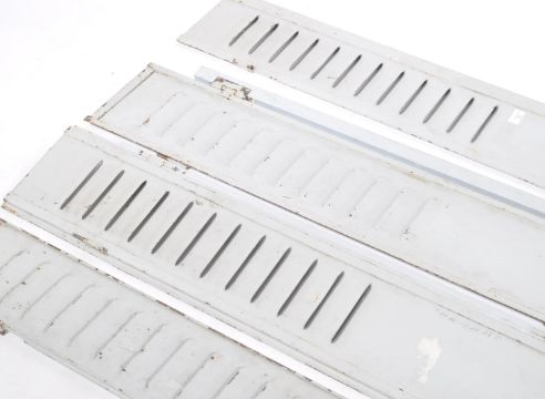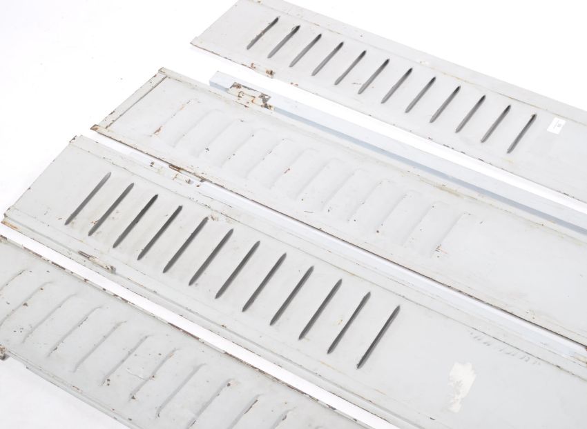 A pair of vintage mid century painted French metal bi-fold window shutters - louvre door windows. Eachj finished in a grey pastel paint with Louvre vents to the top