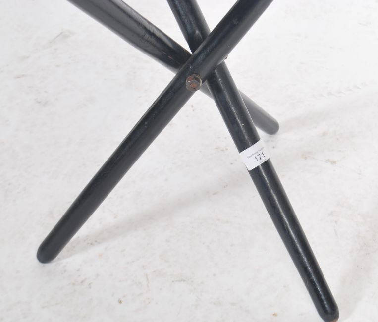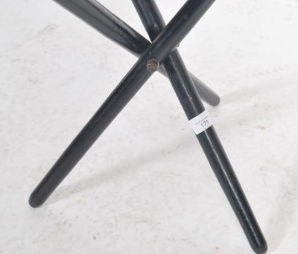 A 1970's Safari stool being raised on an ebonised folding tripod vase having a good pony skin hide upholstered top above