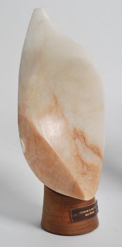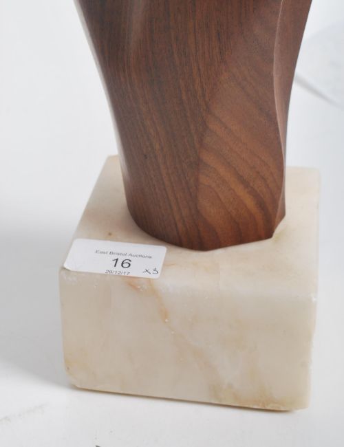 A collection of mid century scupltures by Jan Orpen sculptures in teak and alabaster. Each on socle plinths, 2 with notation, one marked Fecundite, the other Form in Alabaster. Largest measures 44 cm.