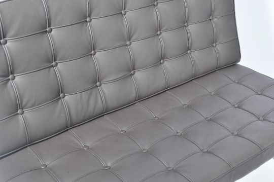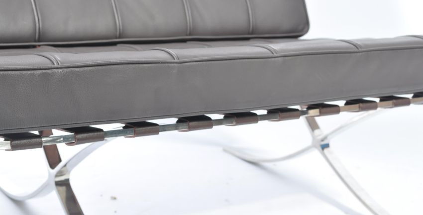 After Mies van der Rohe - A Barcelona type two seater settee / sofa. The design is formed from a chromed curved steel frame with leather webbing and black leather button backed cushions. Measures 80cm high x 130cm wide.