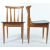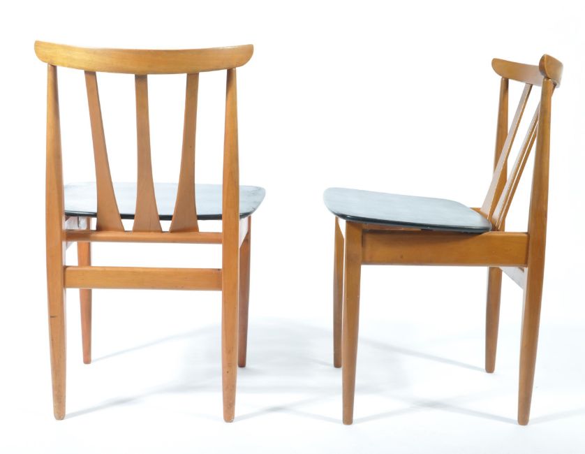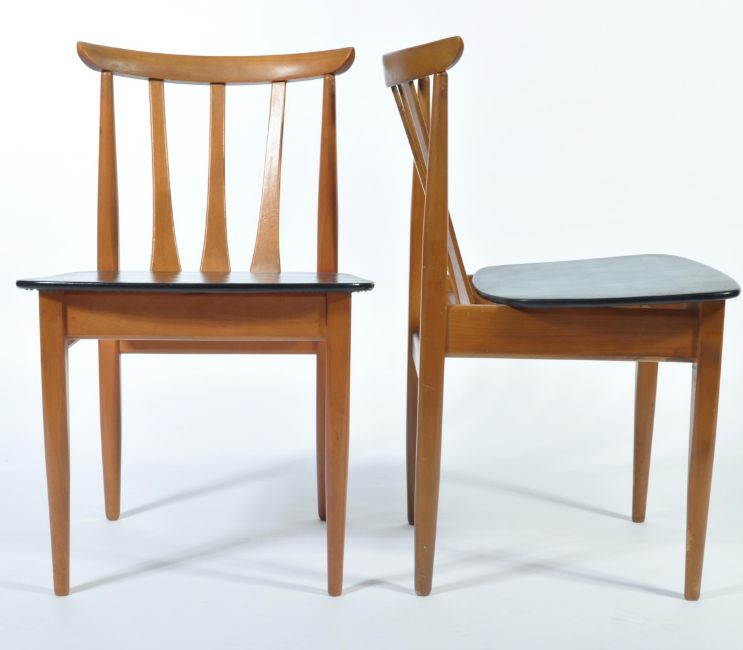 EoN - Elliotts of Newbury - A good set of four teak wood slat back dining chairs, the slat having splayed bottoms. The seats being in a black vinyl covered panel, all raised on round tapered legs. Measures 72cm high x 46cm wide x 46cm deep.