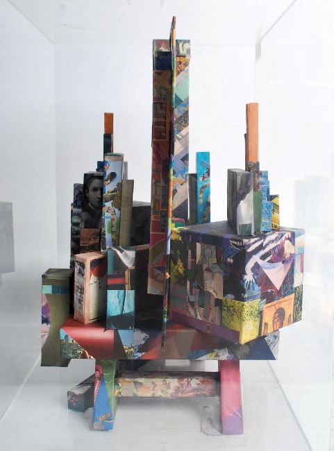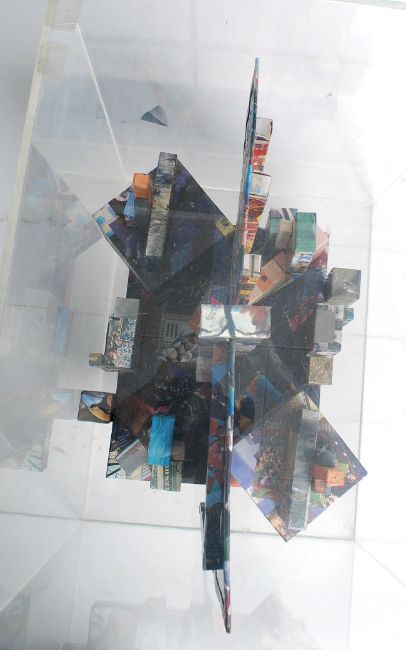 A 20th century mixed media sculpture set within a perspex display case. The case with notation for R Nichols 2004 - Opus 2094. Measures:  49cm high x 45cm wide x 34vm deep.