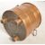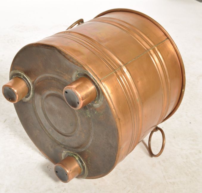 A pair of early 20th century vintage copper ' Cigarette Ends ' bins. Each of cylindrical form with inverted top having central hole with notation surrounding. Measures 30cm high x 34cm wide x 31cm deep.