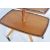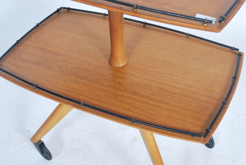 A vintage retro 20th century teak wood Danish influence metamorphic two tier display trolley raised on four angular legs with large castors, the two tiers raised on a fluted column having a tubular gallery with metamorphic twist action.