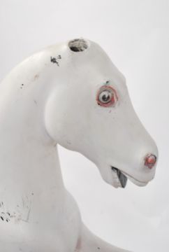 An original 1950's / mid century fairground carousel horse of composite construction in the white painted finish with recess for pole etc to underside. Measures 83cm high x 126cm wide x 30cm deep.