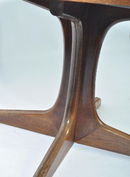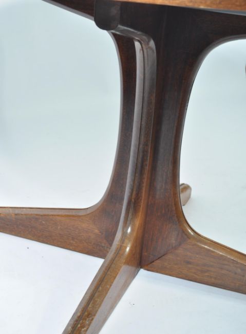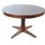 A 1970's retro Danish influenced circular / round dining table in the manner of Heltborg Møbler. The table with splayed legs extending with the top having flip over leaf to centre