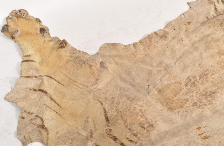 A full sized early 20th Century Indian tiger skin rug. Heavily worn being once mounted ( now removed ) black felt. Some damage and worn skin holed and split in places with discolouration