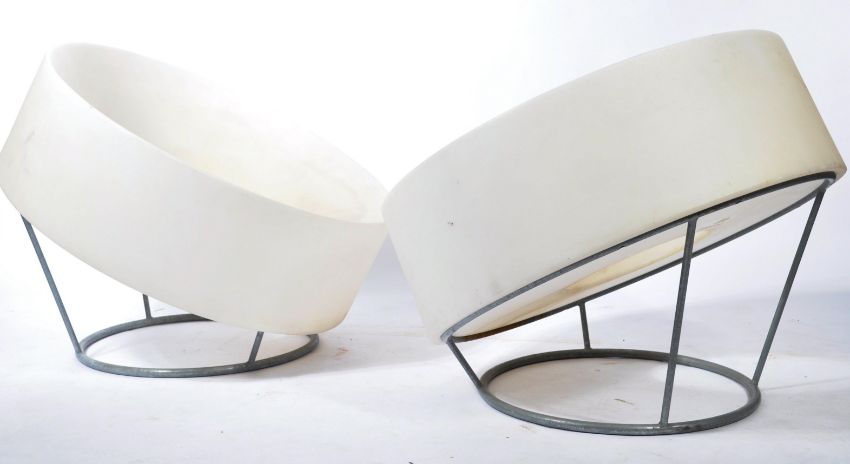 Enzo Berti - A pair of 21st Century pop chairs designed for Ferlea Italy, a translucent white polythene moulded tub type chair raised on a zinc metal tubular frame. Marked to underside for Ferlea, also been seen in the Big Brother house on channel 4. Measures 78cm high x 89cm wide x 89cm deep.