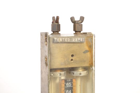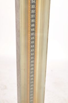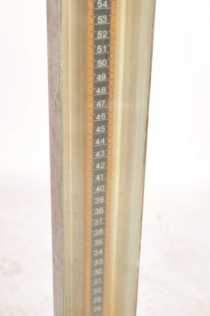 A mid century Industrial meter with mahogany base, metal uprightr with gauge and central phial. Tested 25psi believed to test gas. Ideal for upcycle project for a table lamp. 84cms high