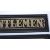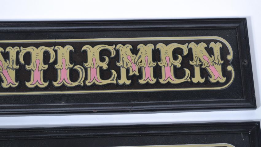 A pair of fabulous mid century mirror glass framed signs ' Ladies & Gentleman ' Each sign in wooden frame with black mirror glass being with central notation of pink and gold colourways. Measures 22cm high x 80cm wide each.