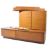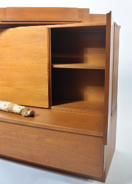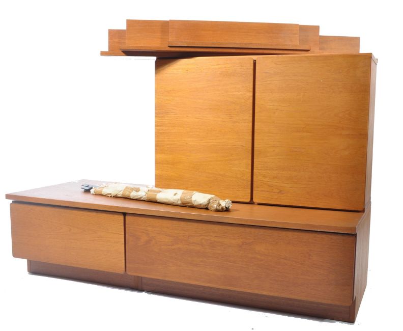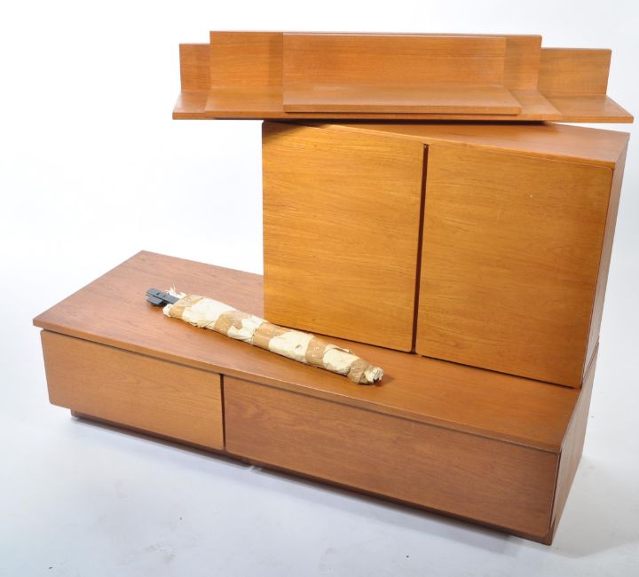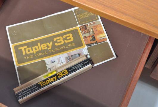 A retro mid cenutry Beaver & Tapley modular shelving system -media unit comprising of a selection of wall mounted shelves over double door blind fronted cupboard with sideboard media unit base to floor. Complete with the spirit level and brochure. With suspension bars for shelves Please see images. Measures: 140cm wide.