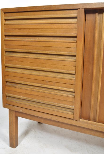 A rare pair of mid century teak wood sideboards. Each of good proportions having a bank of reeded, blind fronted drawers flanked by a pair of sliding cupboard doors. All raised on squared legs,.