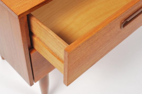 A 1970's Danish influenced teak wood sideboard of Danish influence having a series of short drawers and  raised on tapered legs. The drawers  with recessed lozenge style handles. Measures 96cm high x 69cm wide x 49cm deep.