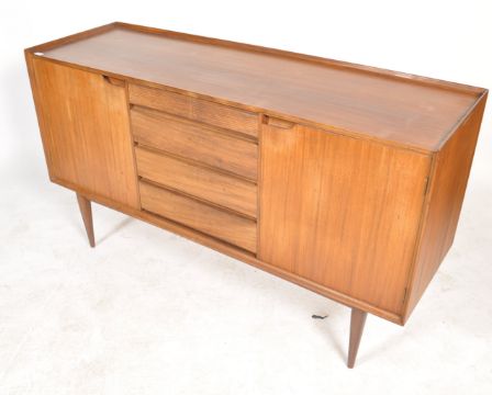A 1970's mid century retro / vintage teak sideboard  by Robert heritage for Archie Shine. The sideboard of good proportions being  raised on tapered legs with a series of cupboards flanking a bank of drawers with reeded details to centre. The sideboard finished with a shaped gallery top. Matching dining table and chairs in lot 169.   Measures:  84.5cm high x 153cm wide x 49cm deep.