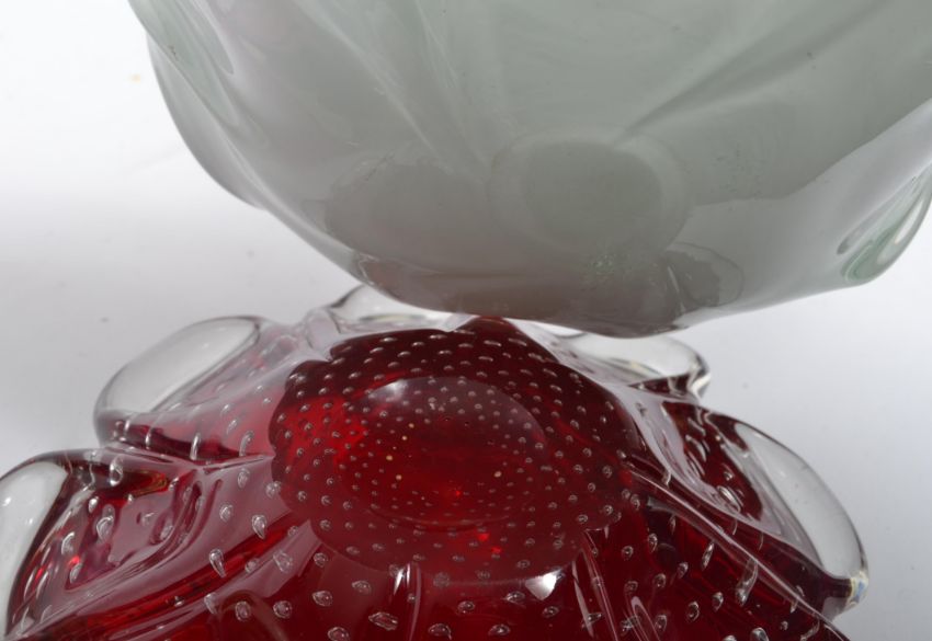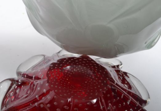 A retro Murano Sommerso cased vase of multiple colours and of tall lozenge tapering form together with a smaller case vase, two tone scalloped bowl, red glass control bubble bowl ( 4 total ) Measures 50cm high.