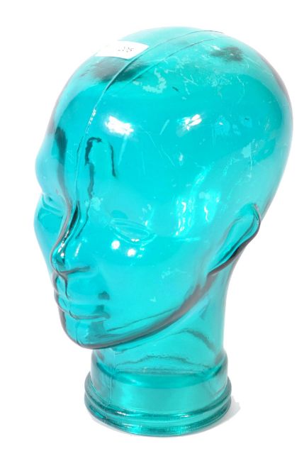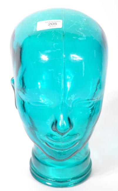 A 20th century art deco style moulded pressed glass phrenology type head - shop display stand / milleners mannequin head. Moulded and pressed glass of blue colour with moulded features. Measures 28cm high x 16cm wide x 22cm deep.