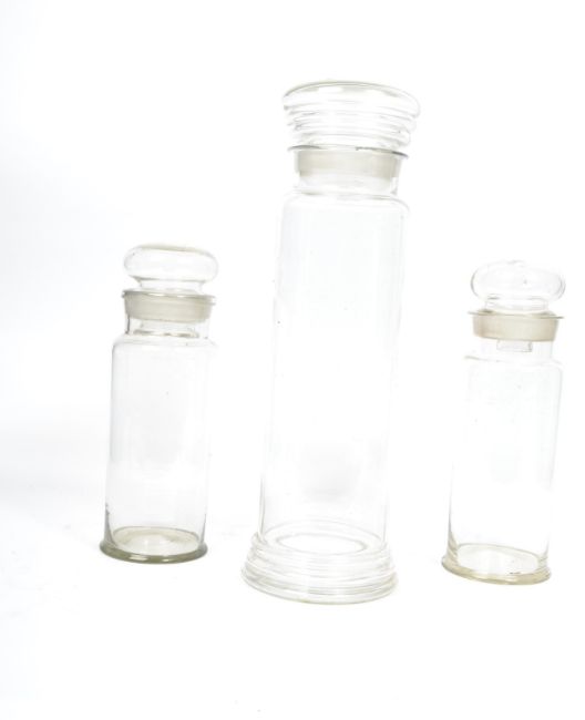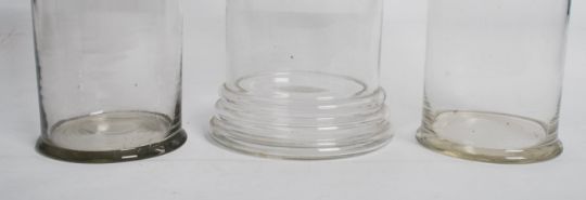 A good set of 3 early 20th century shop sweet - confectionary jars. All of tall cylindrical form complete with the stopper lids. One of large oversized form. 53cm tallest.