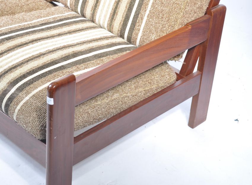 An early 1960's Guy Rogers 'Manhattan style ' teak 3 piece suite -sofa settee and armchairs possibly designed by George Fejer and Eric Pamphilo. The teak wood frame with angular arm supports having original upholstered frame.