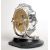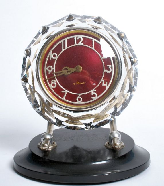 A 20th century Russian 17 jewel movement mantel clock, having faceted circular surround to Arabic numeral dial inscribed Majak made in USSR to verso, supported on chrome arms and circular ebonised plinth base. Measures 21 cm high.