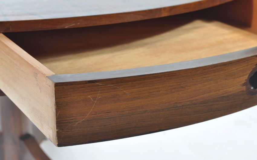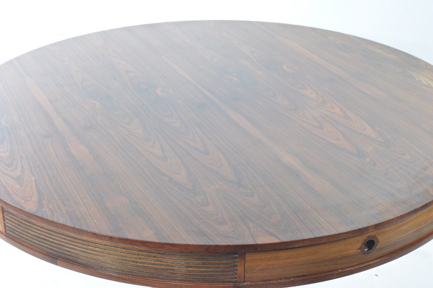 A mid century retro Robert Heritage for Archie Shine large drum shaped dining table. The round top with three frieze drawers interspersed with horizontal reeding and being raised on a tripod base