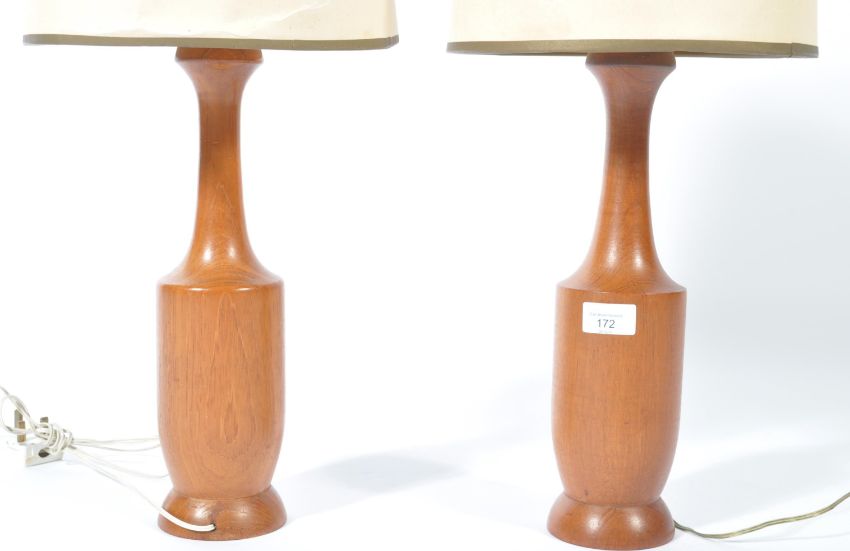A pair of retro mid 20th century turned teak wood table lamps, each lamp with matching retro floral shades. Measures 75cm tall.