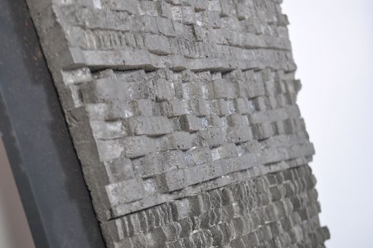 An unusual 20th century cast metal studio art sculpture of tapering form with ribbed design. Constructed of a base cast metal and mounted to a wooden plinth base. Measures 62cm high x 40cm wide.
