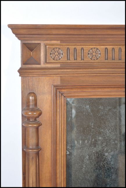 A 20th century French walnut large overmantel mirror with carved columns to the side and cornice atop, all over central bevelled mirror glass