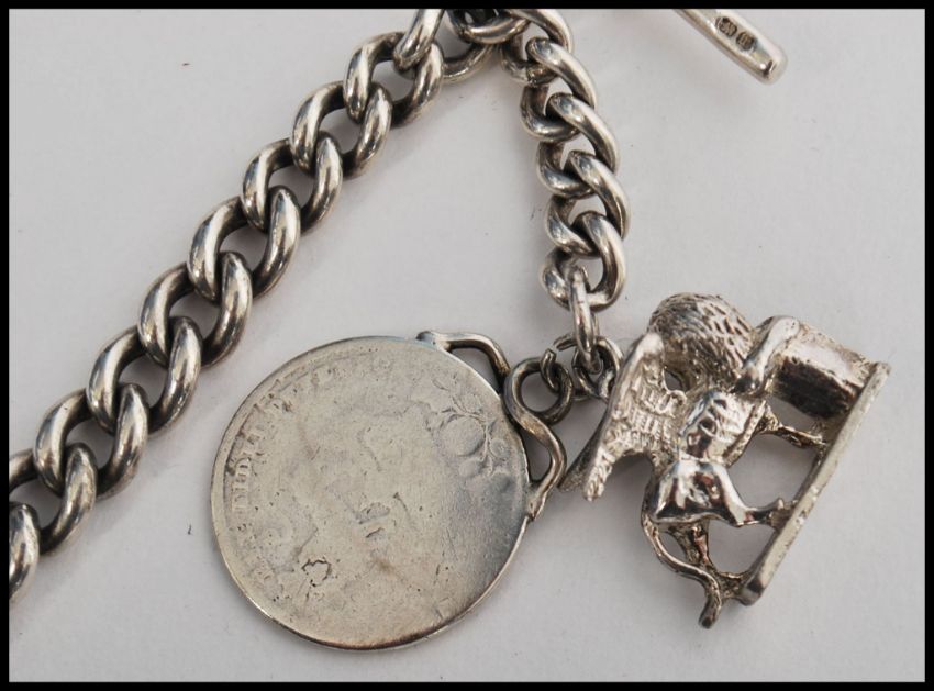 A silver hallmarked fob chain with attached fob medals, each link stamped with a contemporary full hunter pocket watch.Gross weight 110g and the chain measuring 22cm long.