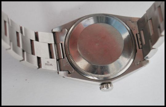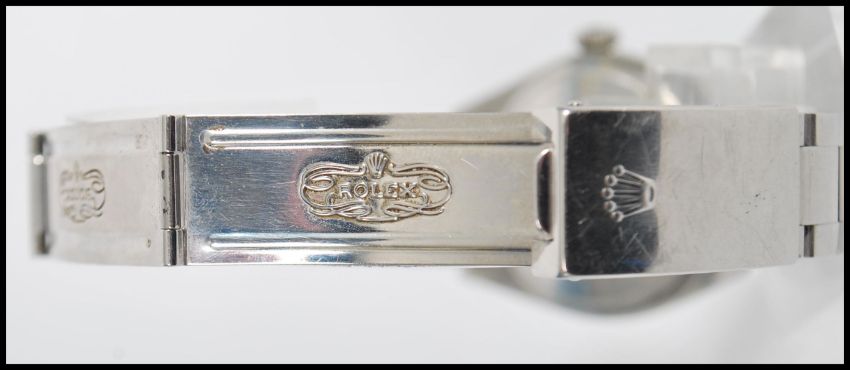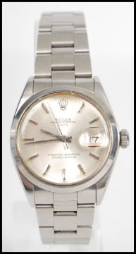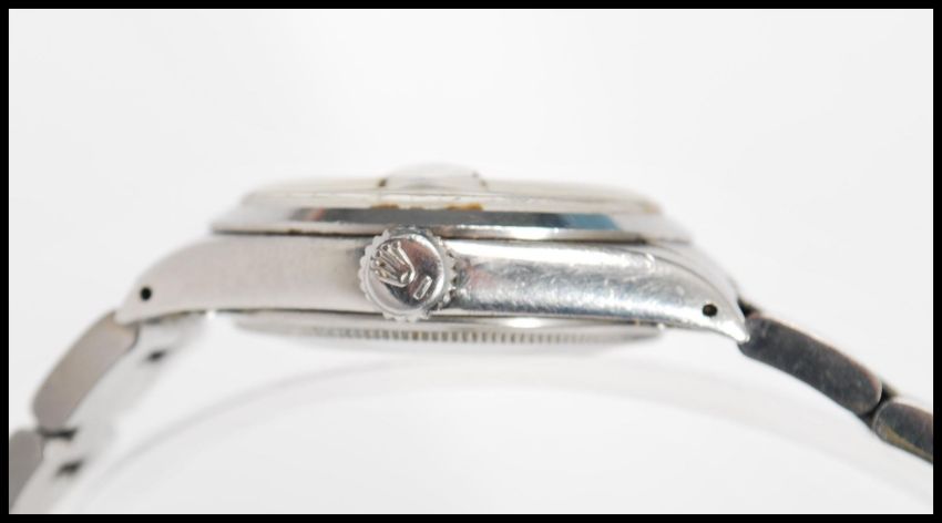 A vintage 20th century 1960's Rolex Oyster Perpetual Date wrist watch set to a stainless steel bracelet. The silvered dial with notation Superlative Chronometer Officially Certified. Roles crown winder to side. Weighs 87.1 grams.